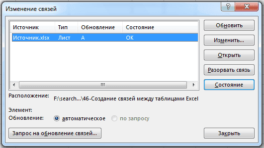 Чтобы управлять ссылками на источники в других книгах, щелкните Лента данных — Подключения — Редактировать ссылки. В открывшемся окне отобразится полный список подключенных файлов и командных кнопок: