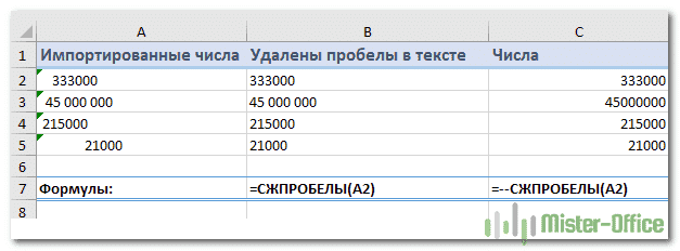 Как убрать пробелы в числах в Excel