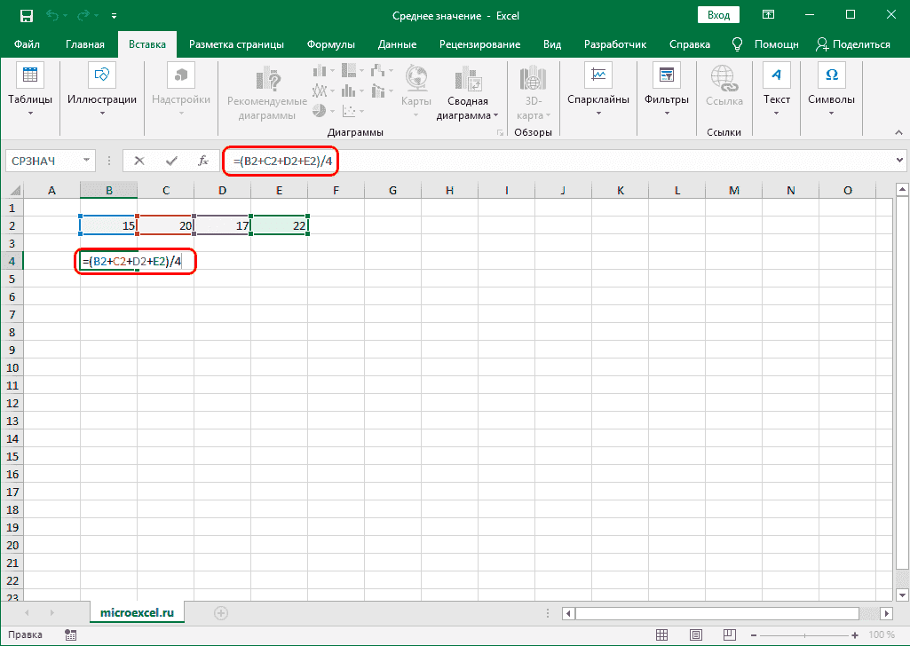 Окончательный вид формулы следующий: = (B2 + E2 + D2 + E2) / 4.