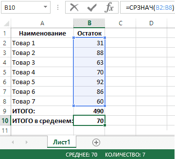 Если существует диапазон ячеек B2: B8 с числами, формула = СРЕДНЕЕ (B2: B8) вернет среднее значение данных чисел в указанном диапазоне: