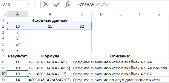 Как видно из примера, в ячейке A9 функция AVERAGE имеет 2 аргумента: 1 - диапазон ячеек, 2 - дополнительное число 5. В аргументах вы также можете указать дополнительные диапазоны ячеек с числами. Например, как в ячейке A11.