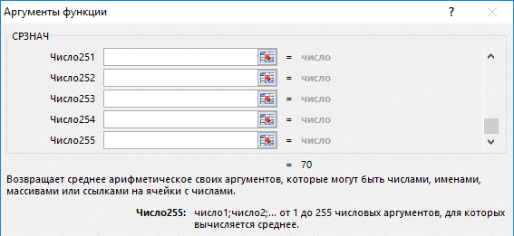 Синтаксис следующий: = СРЕДНЕЕ (число1; [число2];...), где первое число является обязательным, а все последующие аргументы (до числа 255) необязательны для заполнения. То есть количество выбранных исходных диапазонов не может превышать 255:
