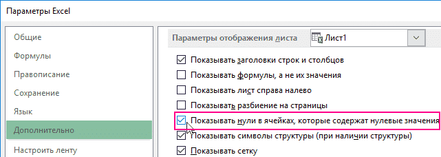 При вычислении средних значений помните о разнице между пустой ячейкой и ячейкой, содержащей нулевое значение, особенно если в диалоговом окне Excel снят флажок Показывать нули в ячейках, содержащих нулевые значения. Если этот флажок установлен, пустые ячейки игнорируются, а нулевые значения - нет. Чтобы отменить выбор или установить этот флаг, откройте вкладку «Файл», затем нажмите «Параметры» и выберите группу «Показать параметры для следующего листа» в категории «Дополнительно», где вы можете установить флажок: