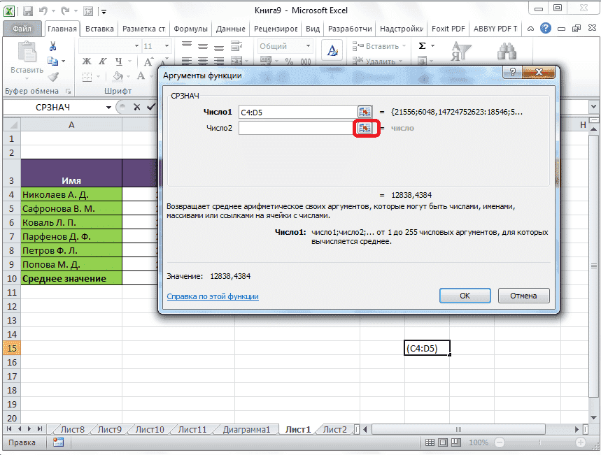 Если вы хотите вычислить среднее арифметическое между числами, расположенными в разрозненных группах ячеек, выполните те же действия, которые указаны выше в поле «Число 2». И так до тех пор, пока не будут выбраны все необходимые группы ячеек.