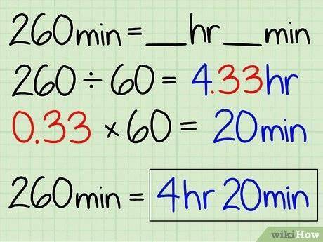 - Например, преобразуйте 260 минут в часы и минуты. Сначала преобразуйте минуты в часы: 260 минут x 1 час / 60 минут = 4,33 часа или 4 1/3 часа.