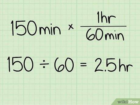 - В нашем примере: 150 минут x 1 час / 60 минут = 2,5 часа или 2,5 часа.