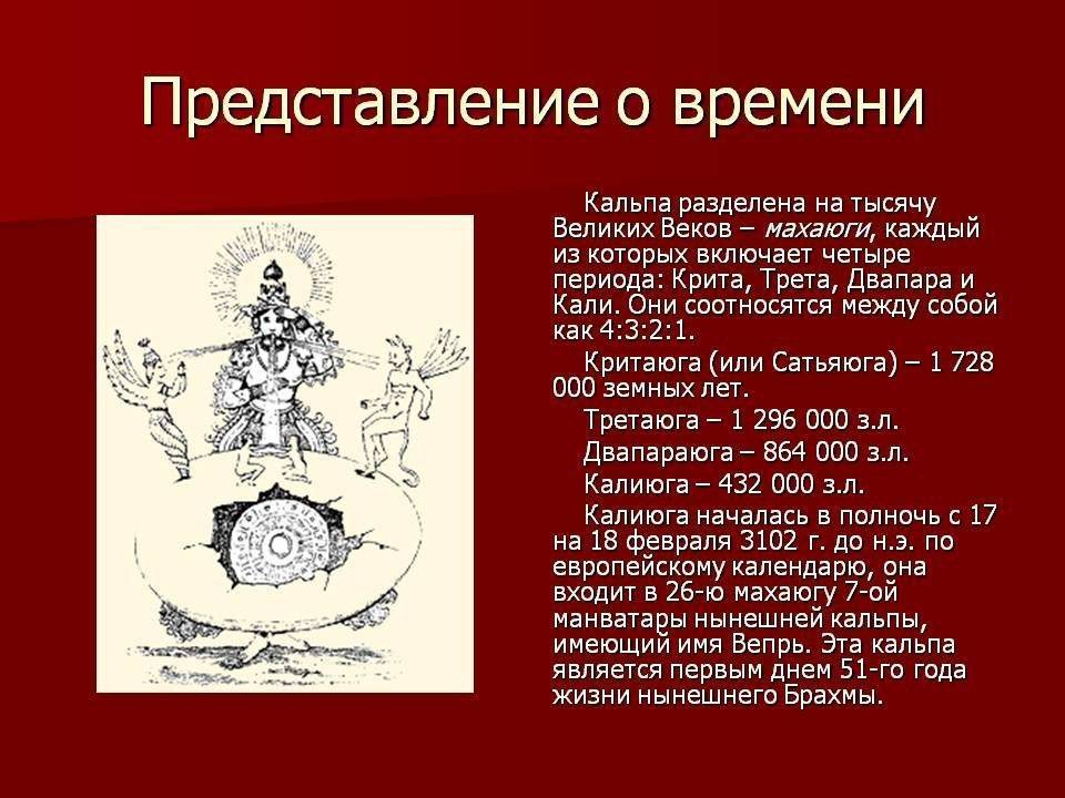 Кальпа в индуизме также называется «днем Брахмы». День сменяется ночью равной продолжительности. 30 дней и ночей составляют месяц, а год состоит из 12 месяцев. Вся жизнь Брахмы составляет 100 лет, после чего мир погибает вместе с ним.