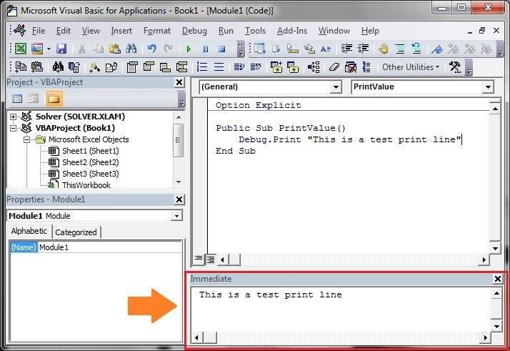 В приведенном выше примере я использовал Debug.Print для печати в непосредственном окне. Чтобы отобразить это окно, выберите «Вид» -> «Непосредственное окно» (Ctrl + G).