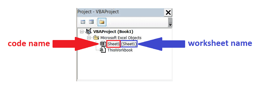 Если вы посмотрите в окно свойств VBE, вы увидите оба имени. На рисунке вы можете видеть, что кодовое имя - это имя вне скобок, а имя листа находится внутри скобок.