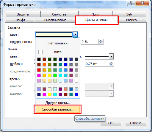 Найдите вкладку Цвета и линии. В палитре есть две дополнительные линии. Выберите методы заливки….