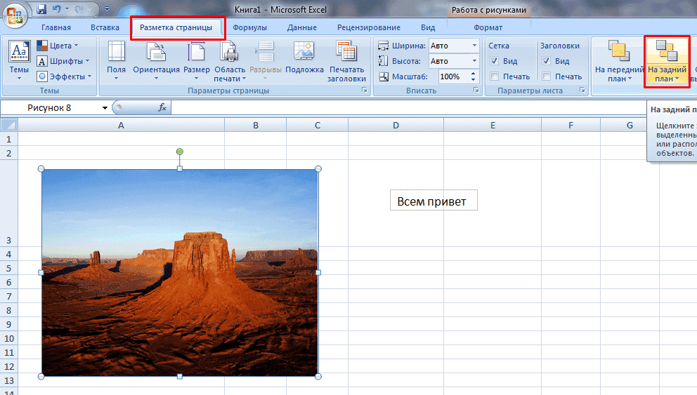 В excel рисунок на задний план