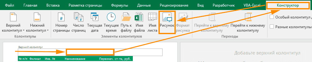 - Щелкните мышью в центре области заголовка и нажмите кнопку Изображение на открывшейся вкладке «Конструктор». Выбираем наше сохраненное изображение.