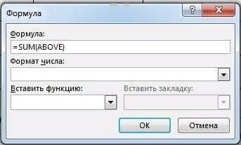 В окне Формула по умолчанию используется операция сложения (СУММ).