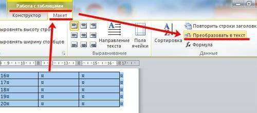 Если вы хотите преобразовать его в текст, т.е все границы будут удалены, а введенные данные останутся, выделите его целиком, щелкая стрелки в разные стороны в верхнем левом углу. Затем перейдите на вкладку «Инструменты для таблиц» и откройте вкладку «Макет». Здесь нажмите кнопку «Преобразовать в текст».