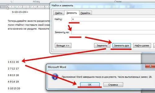 А теперь заменим разделитель пробелами. Для этого нажмите Ctrl + H. В поле «Найти» поставьте свой знак, у меня есть «+», в поле «Заменить на» поставьте пробел, уж точно вы его не увидите. Щелкните «Заменить все». Данные будут разделены пробелами, и появится окно, указывающее, что замена прошла успешно.