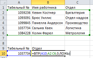 Когда ключевое поле находится справа от данных, которые вы хотите получить, функция ВПР не поможет. Если бы, конечно, можно было установить column_number -1, не было бы проблем. Распространенное решение - добавить новый столбец A, скопировать имена сотрудников в этот столбец, ввести номера сотрудников с помощью ВПР, сохранить их как значения и удалить временный столбец A.