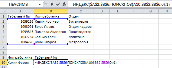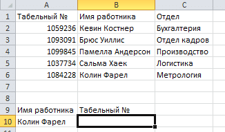 Но бывают ситуации, когда у вас есть имя сотрудника и вам нужно вернуть его штатный номер. На иллюстрации в ячейке A10 имя сотрудника, и вы хотите определить штатный номер в ячейке B10.