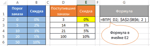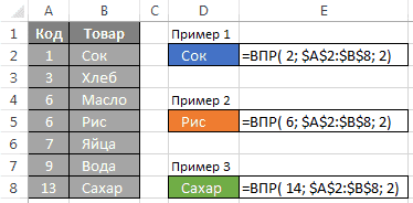 В этом примере показано, как работает функция. Когда вы вводите значение в ячейку B2 (первый аргумент), функция ВПР ищет ячейки в диапазоне C2: E7 (второй аргумент) и возвращает ближайшее приблизительное совпадение из третьего столбца диапазона, столбца E (третий аргумент).