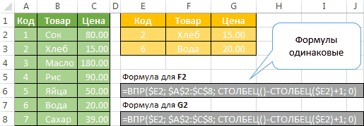 Если таблица, из которой вы извлекаете данные с помощью ВПР, имеет ту же структуру, что и таблица поиска, но просто содержит меньше строк, вы можете использовать функцию СТОЛБЕЦ () в ВПР для автоматического расчета номеров столбцов для извлечения. В этом случае все формулы ВПР будут одинаковыми (с поправкой на первый параметр, который изменяется автоматически)! Обратите внимание, что первый параметр имеет абсолютную координату столбца.
