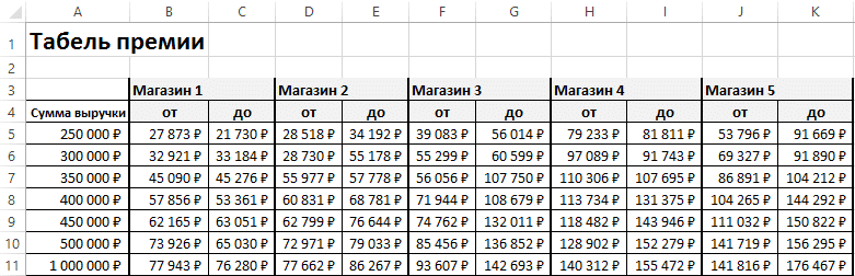 Цель этой таблицы - найти соответствующие значения вознаграждения в диапазоне B5: K11 на основе определенной суммы дохода и магазинов с минимальными или максимальными ограничениями для выплаты премии. Сложность возникает при автоматическом определении размера бонуса, на который может рассчитывать сотрудник при превышении определенного лимита дохода. Поскольку нет четко определенной суммы страхового взноса для каждой вероятной суммы дохода. Есть только лимиты и лимиты на сумму вознаграждений для каждого магазина.
