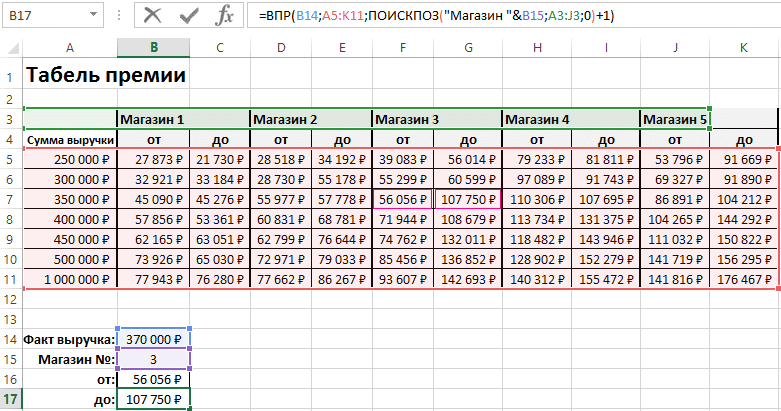 легко видеть, что эта формула отличается от предыдущей только номером столбца, указанным в третьем аргументе функции ВПР. И, следовательно, нам просто нужно добавить +1 к значению, полученному с помощью функции ПОИСКПОЗ, поскольку сумма максимально возможного бонуса находится в столбце, следующем за минимальной суммой, которая соответствует критериям поискового запроса.
