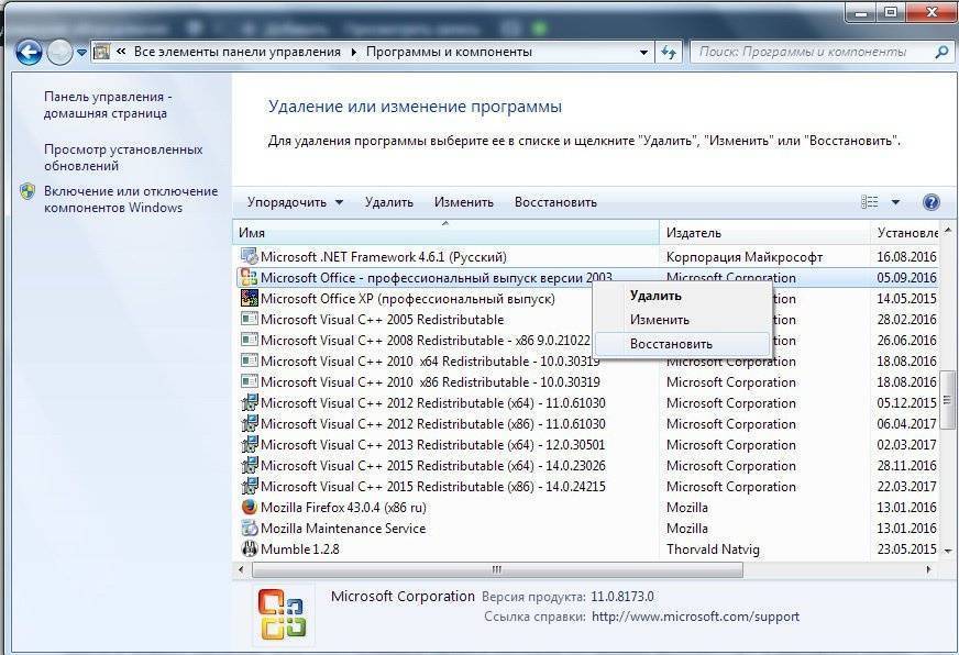 - Восстановите файлы приложения в панели управления. Для этого просто найдите приложение в списке установленных и нажмите на соответствующее поле в меню надстройки программы, если таковое имеется.