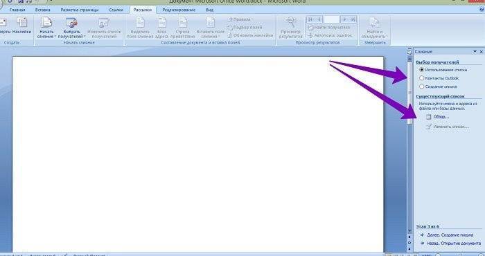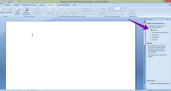Затем щелкните документ, который вы создали в разделе «Рассылка» (версия Word 2007), и выберите параметры «Пошаговый мастер слияния» (экран 1).