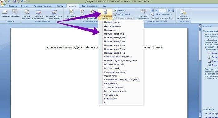 Затем щелкните раздел «Вставить поле слияния» и просто установите данные из таблицы в нужные места в документе Word (снимок экрана 5).