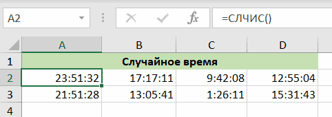 Чтобы вставить случайное время между двумя указанными значениями времени, используйте функцию ВРЕМЯ() или ВРЕМЗНАЧ() в сочетании с RAND():