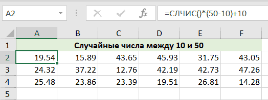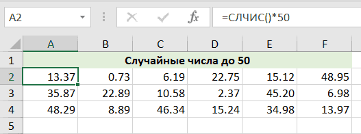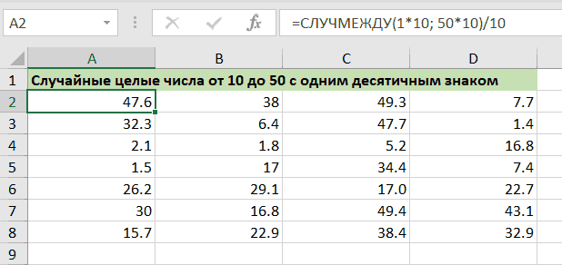 Следующая формула RANDOM BETWEEN() возвращает случайные десятичные числа от 1 до 50: