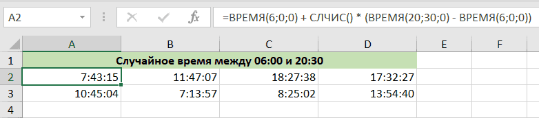 =ЗНАЧ ВРЕМЕНИ("6:00:00") + СЛУЧАЙНЫЙ() * (ЗНАЧ ВРЕМЕНИ("20:30:00") - ЗНАЧ ВРЕМЕНИ("6:00:00"))