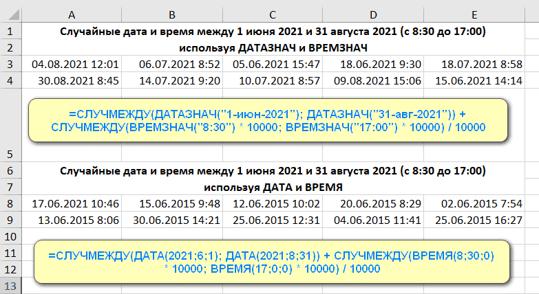 = СЛУЧАЙНОЕ МЕЖДУ (ЗНАЧЕНИЕ ДАТЫ («1 июня 2021 г.»), ЗНАЧЕНИЕ ДАТЫ («31 августа 2021 г.»)) + СЛУЧАЙНОЕ МЕЖДУ (ЗНАЧЕНИЕ ВРЕМЕНИ («8:30») * 10000, ЗНАЧЕНИЕ ВРЕМЕНИ («17:00 ") * 10000) / 10000