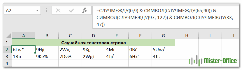 Внимание! Если вы используете аналогичную формулу для генерации случайных паролей, они не будут очень безопасными. Конечно, вы можете создавать более длинные текстовые строки, объединяя больше функций. Однако изменить порядок невозможно, то есть первая функция всегда возвращает цифру, вторая функция возвращает прописную букву и так далее.