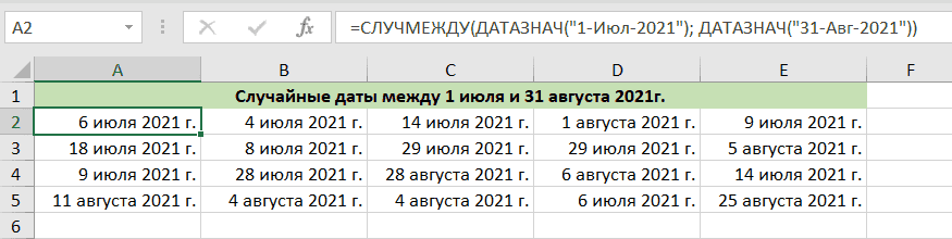 = RANDOMBY(DATEVALUE("1 июля 2021"); DATEVALUE("31 августа 2021"))