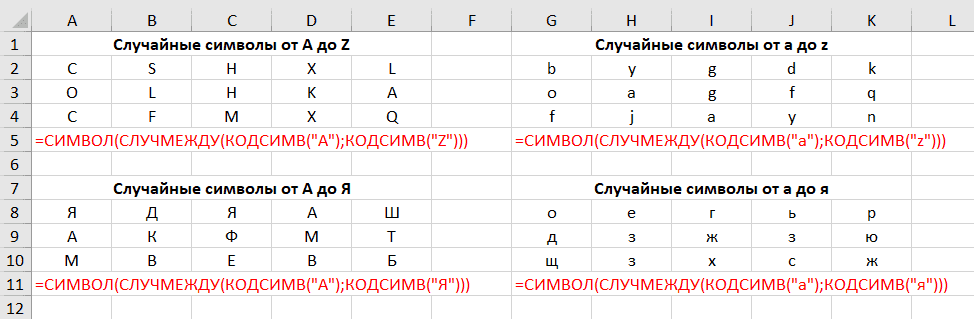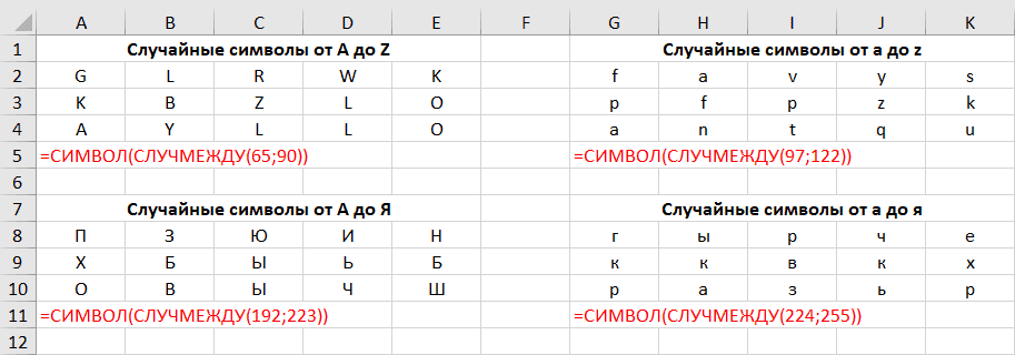Чтобы сделать запись более компактной, я ввел коды ANSI прямо в формулу. Четыре функции возвращают следующие случайные значения: