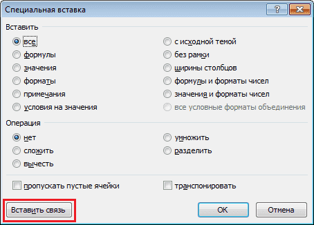 - В появившемся диалоговом окне «Специальная вставка» выберите «Вставить ссылку.