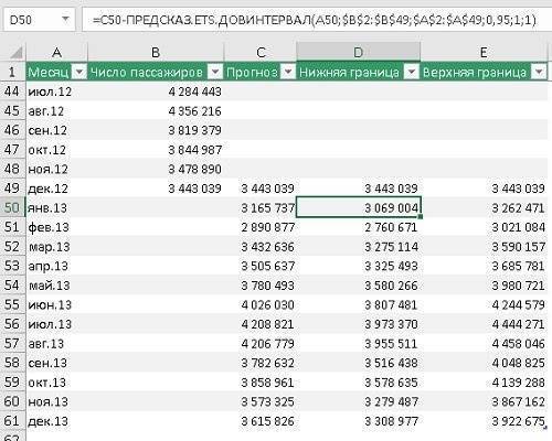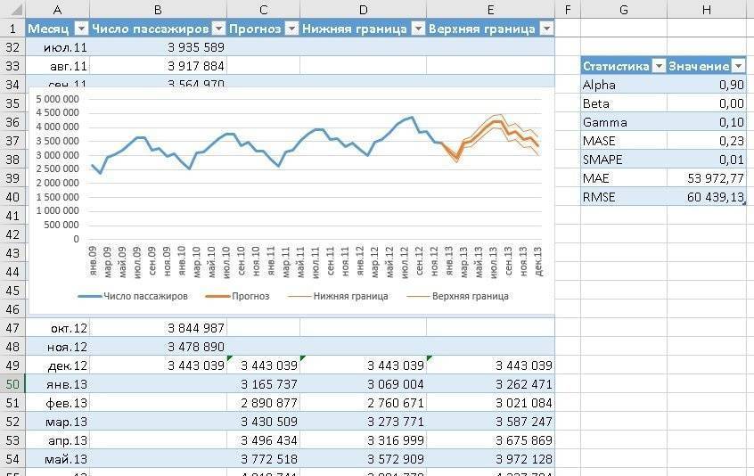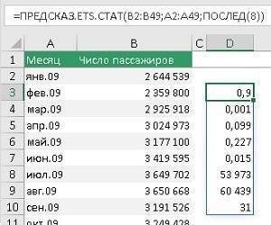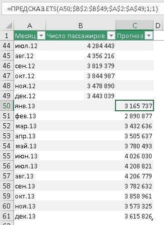 Второй аргумент - values = $ B $ 2: $ B $ 49. Исторические данные о пассажиропотоке можно найти здесь. Ссылка является абсолютной, поэтому при перетаскивании формулы ячейки, на которые указывает ссылка, не изменяются.