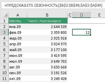 Здесь нет новых для нас тем. В простейшем случае FORECAST.ETS.SEASONALITY берет исторические данные и временную шкалу и возвращает целое число, равное сезонности. В нашем примере - 12: