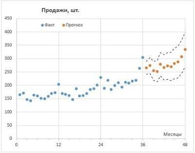 Рис. 1. Прогнозирование продаж в Excel с помощью семейства функций ПРОГНОЗ