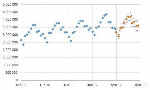 Рис. 6. Исторические и ожидаемые данные о пассажирских перевозках с доверительным интервалом 95