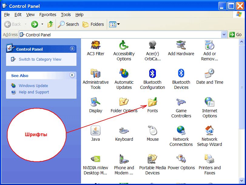 Выберите кнопку «Пуск», затем «Панель управления», в ней запустите иконку «Шрифты