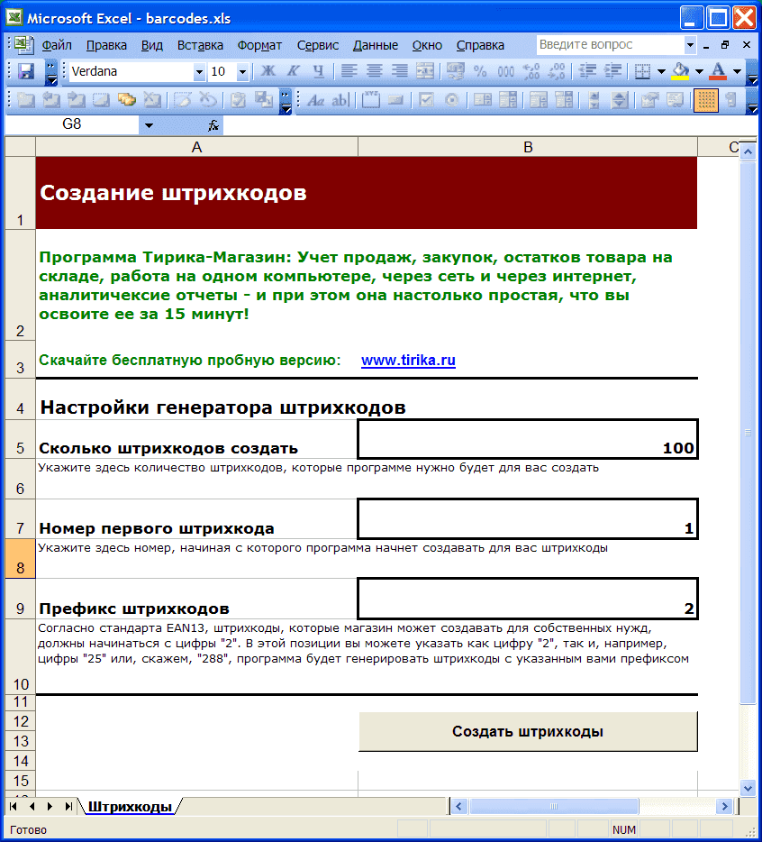 Генератор штрих-кода, который вы сейчас читаете, также представляет собой файл Excel со встроенными макросами. Мы знаем, что в этом файле нет вредоносного кода (вообще наша задача продать вам программу Тирика-Шоп в итоге и не заразить ваш компьютер), но верить этим словам - ваше дело. Если вы решили нам не доверять, то можете прекратить чтение этой статьи и удалить скачанный файл: к сожалению, без макросов загруженный вами файл для генерации штрих-кодов работать не будет.