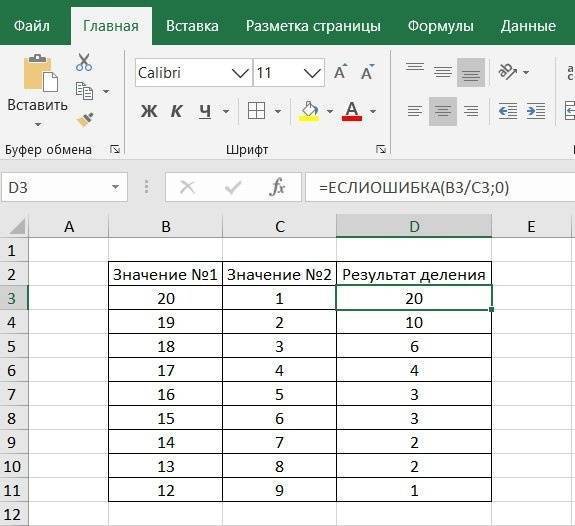 Теперь, если мы поместим число 1 в ячейки C3, в ячейках D3 мы получим результат деления 20/1 = 20.