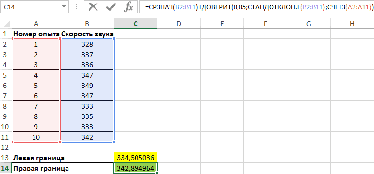 Чтобы определить границы, нам все равно нужно будет вычислить выборочное среднее. Но, поскольку алгоритм расчета по формуле СРЕДНИЙ такой же, как и в предыдущем методе, и результат также не изменился, мы не будем подробно останавливаться на этом второй раз.