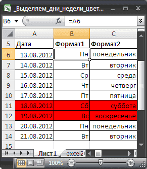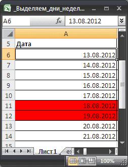 Даты в столбце A с днем недели> 5 будут выделены красным.