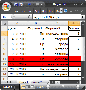Пусть столбец D содержит номер дня недели, например, в ячейку D6 введите формулу = ДЕНЬ НЕДЕЛИ (A6; 2) .