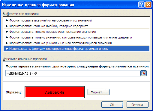 - в поле Формат значений, для которого действительна следующая формула, введите формулу = ДЕНЬ НЕДЕЛИ (A6; 2)> 5