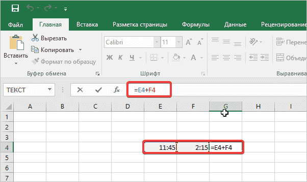 Активируем пустую ячейку, переходим в строку формул, где ставим знак «=» без кавычек. Нажмите на ячейку с текущим временем, поставьте знак «+», добавьте соседнюю ячейку. Нажмите кнопку «Enter». В результате вы получаете время, которое будет через определенный период (в нашем случае через 2 часа 15 минут).