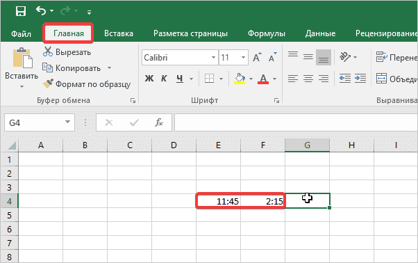 Форматируем лист, если в нем производились предыдущие расчеты, выделяем пустое поле и ставим наши часы в две соседние ячейки. Затем щелкните пустую ячейку рядом с ней. В нем будут производиться все расчеты.