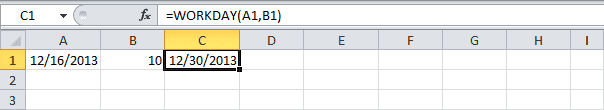 Где A10 - дата начала, а C1 - количество предыдущих (отрицательные числа) или следующих (положительные числа) рабочих дней, за исключением праздников.